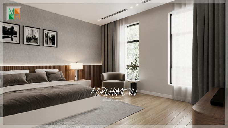 Gia chủ đã tạo ra một cảm giác sang trọng và tinh tế bằng cách sử dụng mẫu nệm ốp tường đầu giường phòng ngủ màu ghi.